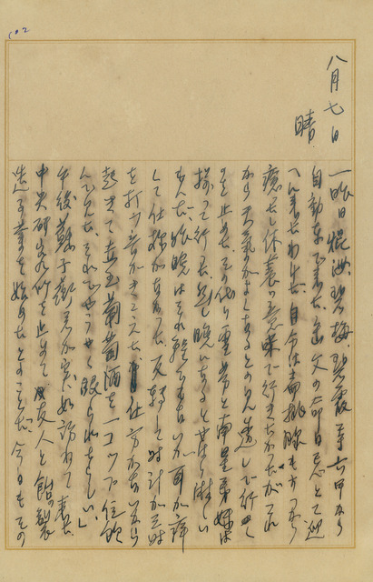 此為吳新榮寫於1939年8月7日日記,前天(8/5)岳父祭日,妻子與子女皆返回六甲娘家,吳新榮未同行;與友人談論事業經營、社會事務一事;整理其周邊人際網路,並列舉不少對其重要之人士;晚上,出席石錫純之洗塵會,並聽其述說自中國之所見所聞。   日本殖民政府為了對臺灣風俗、資產、地理、氣候等項目進行深入研究,於1909年4月成立臺灣總督府研究所,第一任所長由總督府醫學校校長高木友枝擔任;該機構於1921年改制為臺灣總督府中央研究所,下轄農業部、林業部、工業部、衛生部及庶務課等部門。   又,臺灣總督府中央研究所的成立對日人認識臺灣貢獻豐厚,也奠定往後台灣學研究之基礎,至今,許多關於臺灣研究的成果與分析皆得力於當時之基礎;1939年4月,為因應南進戰爭「工業臺灣、農業南洋」之國策,中央研究所被裁撤,並以農業、林業務驗所、工業研究所以及熱帶醫療研究所代之,研究的領域範圍也隨著改組而加深、加廣,並擴及南洋風俗、醫療之研究,最為著名的為奎寧、罌粟相關栽植調查;戰後,國民政府來臺,將教育部設於原址(中山南路5號)。