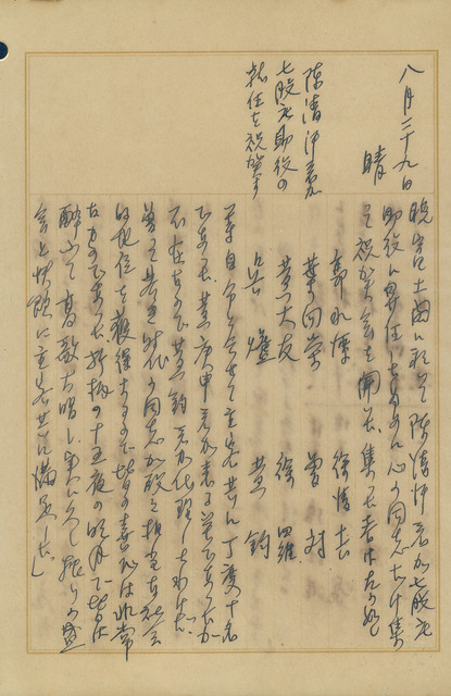 此為吳新榮寫於1939年8月29日日記,與友人共同出席替陳清汗慶祝其就任七股庄助役,恰逢月圓之夜,晚上,與友人們開懷暢飲、放聲高歌。  日記中所提及之助役,其編制於市街庄長底下,相當於今日的「副首長」一職,當庄長無法處理事務之時,助役可代行其事。  又,吳新榮等人十分關心地方公共事務,當周邊友人選舉選上、或被委以地方代之表相關職務,吳新榮與諸位友人皆會為當選者慶祝,並為其感到高興;此外,為了凝聚關心地方公共事務的人士,吳新榮曾於1933年籌組「佳里青風會」,其日記中時常提及的鄭國津、葉向榮、黃清澤、林精鏐、莊培初、黃炭、曾對、黃平堅、郭維鐘、陳清汗、陳其和等人,皆為該會之成員,雖然該會僅存在2個月餘,便因故而解散,但在往後的日子裡仍時常可見他們與吳新榮針對地方選舉議題進行討論,並相互協助,平時也透過打麻將、喝酒等休閒時間交流周遭大小事。