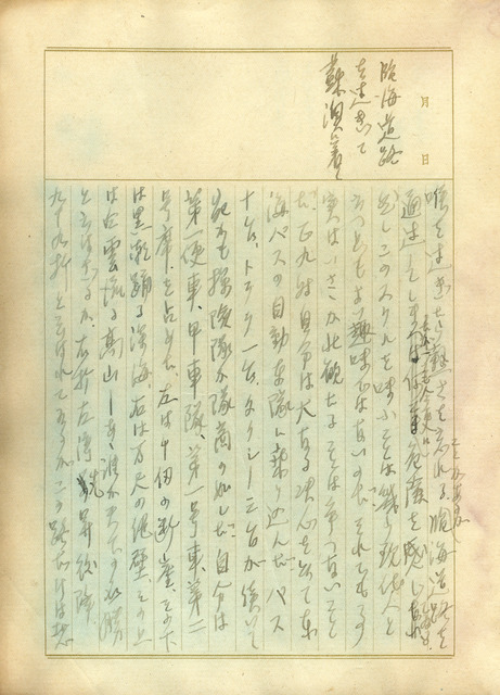 此為吳新榮寫於1940年2月12日的日記。從花蓮經臨海道路到宜蘭,路上艱險,像是經歷了一場冒險。吳新榮在蘇澳下車,搭火車往台北,經宜蘭平原、基隆,在台北下車,短暫訪友後於夜間搭火車回佳里。 吳新榮環台一周的旅程於今日結束,他從花蓮走臨海公路到蘇澳,道路險峻曲折,讓他感觸萬分。臨海公路為今日蘇花公路的前身,沿途有壯闊的清水斷崖美景,因其依山傍海的險峻地形,自古以來交通便十分不易。其最初為步道,主要作為理蕃道路,目的不在提供便捷的交通,而是提供人員、物資往來於各山區間「蕃務官吏駐在所」的通道,後來因為花蓮港廳的產業發展日漸興盛,才於1927年起建設道路,1932年完工。臨海公路開通之後,在常態下是蘇、花兩地每日對開兩班車,花蓮部份由「東海自動車運輸株式會社」獨佔,也就是日記中的「東海巴士」,在《蘇花道今昔》有一段相關的文字紀載:「其行船時間與行車時間相差不多,而二等船位與車資約莫相當,因此東海巴士的客運狀況還算不錯,每日約運輸300人。」,另外,台灣畫家陳澄波有留下〈東台灣臨海道路〉,為當時的臨海公路留下影像,此畫作現藏於日本。