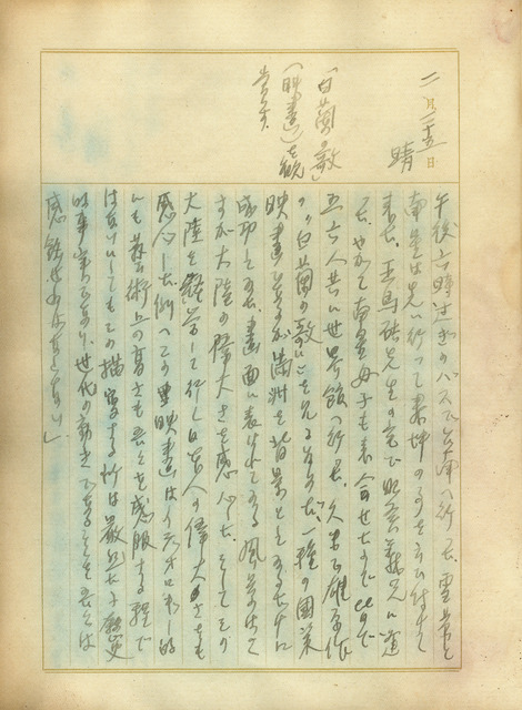 此為吳新榮寫於1940年2月25日的日記。與家人好友一共六、七人去世界館看電影「白蘭之歌」,因為是一部國策電影,意識形態和藝術水準未能滿足吳新榮,但其劇情、史實、壯闊的風景等,都十分雋永。 國策電影為日本在第二次世界大戰時的宣傳手法之一,其主題多與宣揚日本形象、文化和國策相關,那時以電影作為宣傳媒體這樣的手法相當常見,歐美國家也會使用相同的手法宣揚殖民主義、帝國主義。日本政府於1939年制定了《電影法》, 此法讓政府得以請電影公司協力拍攝、製作電影,而這些政府與電影公司合作產出的電影就是國策電影,在所有日本的電影公司之中,日本政府於殖民地滿州成立的「滿洲映畫」,為製作國策電影最積極的公司,吳新榮今日觀賞的「白蘭之歌」即是此公司製作的國策電影之一。「白蘭之歌」是由李香蘭(山口淑子)和長谷川一夫主演的愛情電影,為國策電影「大陸三部曲」系列之一,這系列的電影皆是中國籍女性與日籍男性相戀的劇情,多在滿州拍攝。