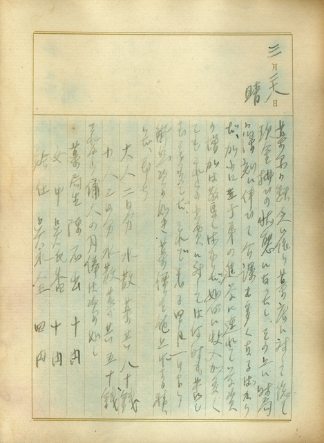此為吳新榮寫於1940年3月28日的日記。因藥品資源不足,須以現金交易,但吳新榮因時局窘迫、稅收增加、手頭要負擔的教育費也增加,感到難以負荷,故決定要調整藥品費用和雇傭薪水。 吳新榮身為自行開業的醫生,在地方上已經算是社會地位較高、較為富裕的階級,但我們卻時常在他的日記中看到為錢或生活用品煩惱的情況,一方面是因為戰爭所致,一方面也是因為吳新榮一人擔負著養活全家的責任,同時還要資助弟妹的學業,可能還要給將軍的家裡一點金錢。在1937年中日戰爭全面爆發後,日本國內開始推行國民精神總動員運動,試圖形成輿論使國民支持戰事,在此同時,殖民地台灣則進入皇民化運動時期,開始推行「皇民化」、「工業化」、「南進基地化」的政策,在精神上同化台灣人為日本人,有意抹去台灣人原先的國族認同,進而成為效忠日本帝國的日本人;物質上則被迫台灣人提供生產所餘及身邊所有物資以支援戰爭,將稻米、金屬、金錢等資源大量輸往日本,供應前線戰事所需,造成了本島物資不足的現象,才會出現後來的配給制度。