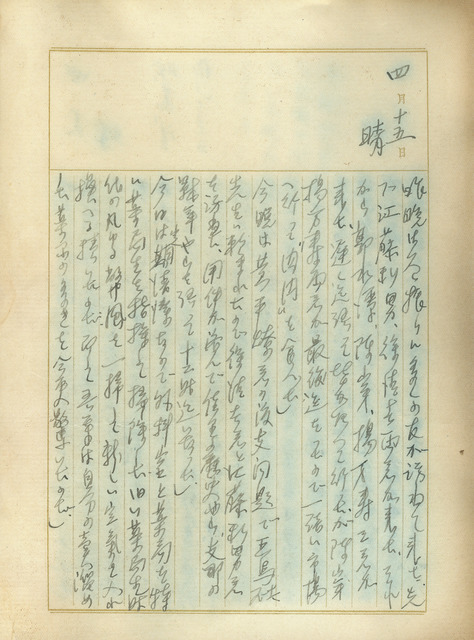此為吳新榮寫於1940年4月15日的日記。昨晚有許多友人拜訪吳新榮,十分難得;今晚吳新榮去找徐清吉和江藤利男商談要事,聊到了佳里的歷史和中日戰爭。此外,今日是藥局清潔日,藥局煥然一新,經過整理後吳新榮發現積存的藥品之多,令人詫異。 徐清吉和吳新榮同為佳里人,為吳新榮摯友,在文學和政治上都時常交流,曾一起成立「佳里青風會」組織,往來頻繁;江藤利男為日本人,也是吳新榮交往數年的好友,在日記中常常可以看到他們的相處互動。今日他們聚在一起商討的要事為黃平燎渡海到中國的問題,黃平燎為鹽分地帶文學集團成員黃平堅的弟弟,也是他們的好友之一。除了這件事之外,他們還聊到了佳里的歷史與當時衝突激烈的中日戰爭,從這些聊天的話題,我們可以看出吳新榮對民俗文物、當下的政治這些領域的關心。二戰結束後,台灣脫離日本殖民統治,進入中華民國時期,吳新榮雖然在政治上難有作為,文化上卻還有繼續自己的志業,在行醫寫作之餘,於1953年加入台南縣文獻委員會,投入地方文史編纂工作,可說是從很久以前開始,就默默耕耘已久的成果。