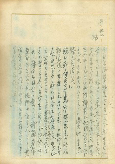 此為吳新榮寫於1940年5月27日的日記。早上兒子吳南星因要遠足非常興奮,家中氣氛熱鬧。晚上吳新榮去參加邱贊生的婚禮,他是由吳新榮介紹才到日本留學,其父邱標也曾幫助吳新榮選佳里街協會議員,與吳新榮交情不淺。回家時,巧遇郭水潭、陳培初、鄭國津,故一起去富士閣吃晚餐,又遇徐清吉、李自尺,一行人叫來在吳新榮家中的陳清汗,七人齊聚一堂。他們早年時常湊在一起,各有事業四散後現再度相聚,令人欣喜,之後他們又去西美樓續攤。 郭水潭、陳培初、鄭國津、徐清吉、李自尺、陳清汗加上吳新榮共七人,都是1933年成立的佳里青風會草創時期的成員,也是鹽分地帶文學社群的同好,彼此除了有文學興趣上的往來,也時常一起打麻將,交情深厚。雖然他們已經許久未一群人一起宴遊,但吳新榮跟這些人還是會碰面,像是郭水潭跟吳新榮最近也有見到面,在5月22號的日記中,還有看到他們因彼此之間的誤會而有書信往來,當時尚未解決的心結,今日就以郭水潭感激地接受吳新榮的意見化解了,兩人盡釋前嫌。吳新榮的交友廣闊,最主要的部分是他的文學同好、學生時期的同學,其中有不少朋友會和他一起參與地方上的政治活動,因為吳新榮有從政的抱負,所以會多拉攏志同道合的人一同努力,並組織各種團體,對他而言,聚會不僅是娛樂和放鬆,也是社交應酬的一環。