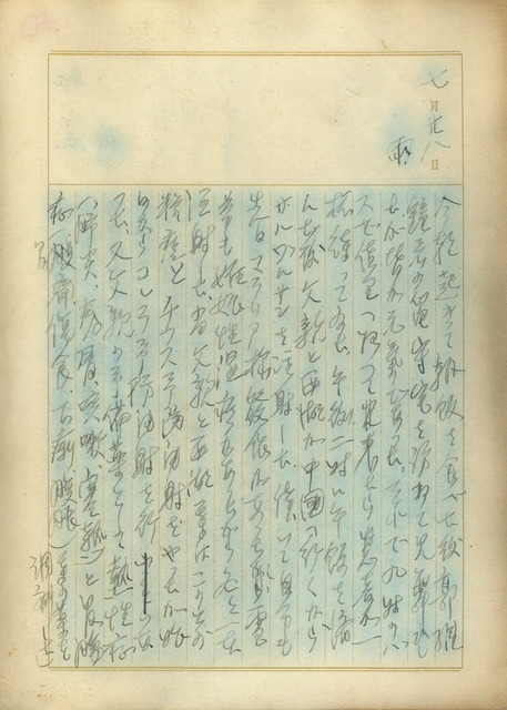 此為吳新榮寫於1940年7月28日的日記。昨日吳新榮住在台南,回佳里前他先去郭維鐘家,向他的家人問安。到佳里後吳新榮回院看診,下午幫將前往中國的父親、弟媳注射サルワルサン,並準備好出國的應急藥品。因自己疑似有瘧疾,雪芬有妊娠性濕疹,他也為自己和妻子各打了一針。 台灣早期衛生環境欠佳,傳染病蔓延,直到日本政府治台後從各個方面積極處理衛生問題,如:下水道清潔整治、廣設醫院、普及傳染病預防接種……,台灣的衛生情況才逐漸獲得改善。此行吳興榮的父親吳萱草,與吳新榮弟弟的妻子沈西湖要前往中國,吳新榮便為他們注射了各種預防針、應急藥品,其中有一劑預防針是為了預防霍亂。霍亂為當時棘手的流行病之一,曾有過好幾次世界性的大流行,20世紀初期在亞洲地區也有掀起一波大範圍的流行,主要從印度、新加坡、東年亞地區爆發,傳入中國、台灣、日本等地。