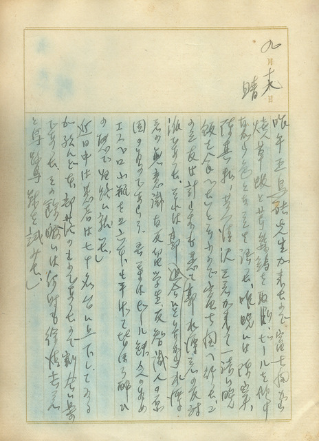 此為吳新榮於1940年9月19日撰寫的日記。吳新榮描述前日中午與王烏硈飲酒吃飯,並談事情。晚間則與陳穿、陳其和、黃清澤等共餐於富士閣,得知三位為郭水潭之反對派,推測原因可能是郭水潭有些許的反留學生與知識份子的氣息。近期診所看病人次不少,多為本地人,令吳新榮感到輕鬆,並也在閒暇時與徐清吉下圍棋。   上文提及之郭水潭是臺南佳里人,為吳新榮長年好友,同時也是日治時期臺南鹽分地帶的文學領導人之一。郭水潭的年少時期曾接受私塾的漢學教育,後受日本教育,畢業於佳里公學校高等科,因而主要的創作語言為日文。郭水潭早期作品以俳句與短歌為主,後隨臺灣新文學轉向創作新詩。郭水潭與吳新榮結識於1932年,兩人一拍即合,於1933年即共組「佳里青風會」,雖不久後便解散,但也成為了鹽分地帶文學陣營的起點。爾後兩人與徐清吉等人於1935年又組織「台灣文藝聯盟佳里支部」,固定每周舉行例會探討文學議題,鹽分地帶文學至此成型。郭水潭的創作先後發表於《南溟樂園》、《台灣文藝》、《台灣新文學雜誌》、《華麗島》等刊物,類型包括詩、短歌、小說、隨筆、論述等,而其中最為人稱道的是其新詩,有「島的詩人」之美譽,可說是鹽分地帶作家中在詩歌藝術成就中最高者。