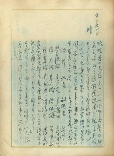 此為吳新榮於1940年9月21日撰寫的日記。吳新榮於日記前晚與黃大友前去拜訪甲本繁二郎,討論佳里街防衛團的組織方式。爾後返家,與河崎又一、陳其和、徐清吉等下圍棋,對弈結束後寫了五封信準備寄出。日記當天的下午,吳新榮為佳里漁業組合的區域整理需要,至金庫尋找自己的股份證書以送至蕭壟信用組合備用。而在尋找的過程中,吳新榮意外尋得其父親被賣至吳家作養子的證明。   上文提及的「防衛團」,是日治時期的戰時組織。有別於學校體系的「青年團」與警察體系的「壯丁團」,「防衛團」由州廳所管轄,一般的青年人、中年人皆可參加。「防衛團」主要是協助空襲時的救火、防毒、衛生等工作,可以說是在積極的防空手段(如:攔截戰鬥機與地面防空砲火)失敗以後,降低民眾傷亡的最後手段。1936年,《臺灣國民防衛規程》出臺,各地的防衛團開始先後組立,除現役軍人、公務員、特殊防衛團員或已有重要任務在身者,不論是臺籍或日籍,只要符合資格的成年男性皆有參加防衛團的義務。日記中,吳新榮出任佳里街防衛團的防毒班班長,也是屬於義務職。而從吳新榮接近戰爭末期的日記裡,我們便能夠看見「防衛團」以及其後繼者「警防團」,在臺灣制空權喪失的狀況下,發揮了消極防空的效果。