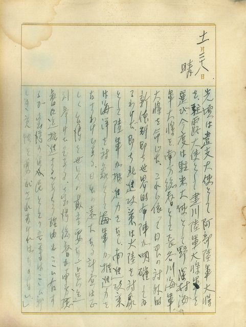 此為吳新榮於1940年11月28日撰寫的日記。吳新榮當日的下午至山子腳外診,並至曾祖父母的墳前祭拜。吳新榮認為自己對經濟、政治、文化、法律了解甚淺,應多對友人學習求知;又認為自己較祖父、父親不諳持家,希望自己能做好自己的事業,不再期望自己能以墓的大小回報祖先。日記中也記錄了當時日本對各國派遣的大使多為軍隊出身,並指出了日本對南、北兩側推進的方針,以及臺灣作為日本戰略據點的意義。   上文中提及了當時大日本帝國在外交佈局上的改變。於同年七月組成的近衛內閣,其外相松岡洋右,意圖藉由強化日德、日蘇關係來作對美國的談判材料,先後促成了「日德義三國同盟」與《日蘇中立條約》,並派軍進入印度支那北部駐守。然而,美國對此的回應則為對日本實施鐵砂禁運,兩國的關係進一步惡化。本日記中提及的三位大使,皆具有軍事背景,或許可以看作當時日本與各國局勢緊張的表徵,也顯示出太平洋戰爭前日本在面對即將到來的戰爭所作的預先布局。