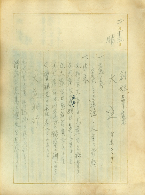 此係吳新榮寫於1941年2月13日的日記。吳新榮在日記中記錄若要配合改姓名運動的創姓草案「大道」的意義與由來。   關於日記中提到的創姓草案,係因當時臺灣總督府配合皇民化運動推行改姓名運動,鼓勵臺灣人改成日本姓名。吳新榮可能是受到1941年1月20日新聞報導指出中壢吳姓家族改姓影響,開始思考改姓名一事,並曾在日記中記錄吳姓改姓的備案有「芦川」、「大道」等,更於1941年1月29日的日記中記錄全家人可採用的日本名字,如他本人改成「兆行」。另臺灣人因受傳統觀念影響,對於改姓名一事並不踴躍,而改成日本姓氏後亦會選擇與原姓氏有關聯的日本姓氏,如吳新榮提道「大道」的由來是大道公(保生大帝)本姓吳,又曾祖名字曾有「大」字等。