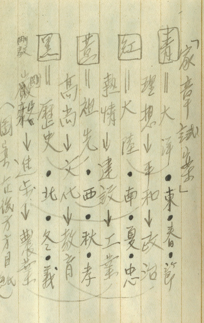 此係吳新榮寫於1941年3月9日之日記。昨日吳新榮之妹吳雪金自長榮女學校畢業,之後將去東京唸書,吳新榮特地到台南為其送行,吳新榮因有事待辦因此與吳雪金約定在火車發車前見面,但之後因事務繁多錯過時間,夜宿旅館。另在日記中紀錄家章試案,詳細說明各種顏色代表的意義,如青色代表大洋、春等。   日記中提到的吳雪金是吳新榮二妹,自長榮女學校畢業後去日本東京就讀日本女子美術學校家政科,畢業返台後任職於佳里初中。早期在教育尚未普及的時候,貧窮人家的子弟並沒有上學的機會,女性更缺乏受教育的機會。日本領有台灣後開始在台灣推行教育制度,1896年設立的國語傳習所並未限制就讀學生的性別,1897年設立的國語學校第一附屬學校女子分教場更是台灣女子教育的濫觴。但即便如此,礙於傳統觀念的影響女子接受教育的比率亦不高,直至1920年代起才逐漸開始女性受教育的風潮,進而影響「新女性」族群的出現。值得注意的是,當時女子教育的內容多以培養「賢妻良母」為目標,因此課程多以縫紉、家政等內容為主,除了台灣總督府的教育方針偏向初等與職業教育外,亦有符合大眾期待的「賢妻良母」的女性形象,以此提升就學率有關。