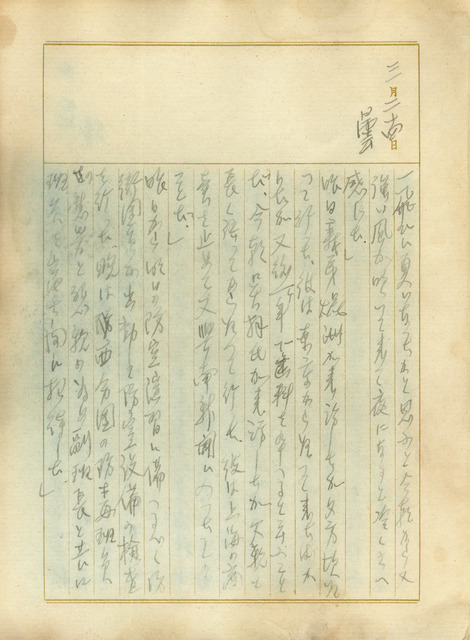 此係吳新榮寫於1941年3月24日之日記。當日之日記補述前一日之事,近兩日有毛焜洲、吳拜等人來訪;另因翌日要舉行防空演習而進行設備檢查,吳新榮晚上與防毒班副班長招待班員去富士閣吃飯。   關於日記中提到的《興南新聞》,原為在東京創刊的《臺灣民報》,1927年獲准在台發行,之後於1930年起改稱《臺灣新民報》,1941年2月為表示支持日本政府的南進政策更名為《興南新聞》,希望可以免除被合併的命運,但1944年時因應戰時媒體統制,台灣各報紙被總督府合併成《台灣新報》,《興南新聞》自此畫下句點。   日治時期在台灣發行的報紙時常受到總督府政策影響,1937年時因應皇民化政策中的國語普及政策,因此下令廢止報紙的漢文欄;1944年時又因戰時體制之下的報紙統制政策,將《台灣日日新報》、《興南新聞》等6家報紙合併成《台灣新報》,多家報紙因此被迫停刊。