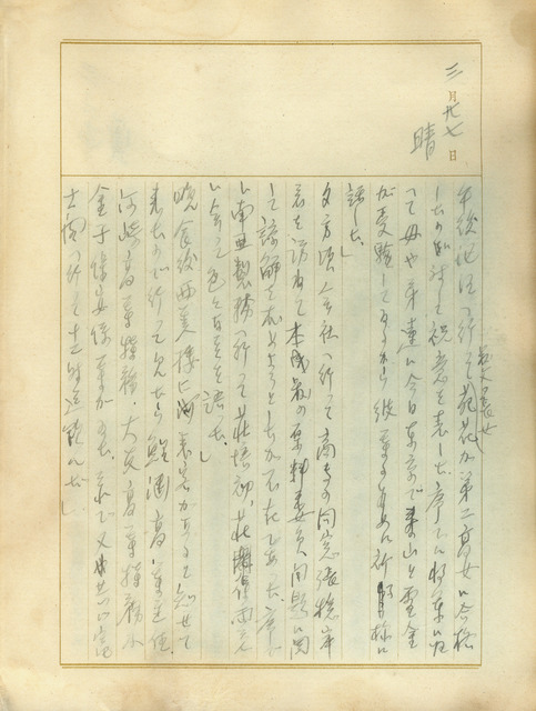 此係吳新榮寫於1941年3月27日的日記。當日吳新榮下午到漚汪慶祝叔父吳丙丁之女考上第二高女,順便回將軍探望家人;傍晚則去糖廠拜訪張穩岸,針對吳本成的原料委員問題求其諒解;晚上則與河崎又一等人在西美樓、富士閣聚會。   日記中提到的吳壽山與吳雪金是吳新榮的弟妹,兩人當時在東京參加考試。關於吳雪金之事,吳新榮1941年3月9日的日記曾提到吳雪金將要去日本讀書,原本吳新榮要去車站送行,但因事務繁多導致行程延宕未成;其後吳雪金考上日本女子美術學校家政科。吳壽山(或名吳國山)之後考取明治大學經濟系,1944年搭船返台途中被美國潛水艇襲擊遇難。   日治時期台灣人子弟因台灣教育制度不平等之故,雖然1922年後設立諸多中、高等學校,但台、日人之間的不平等待遇仍未消除,在高等教育中台灣人面臨激烈的競爭,反而去日本留學會比留在台灣讀書容易的多,吳新榮即是其中一例。