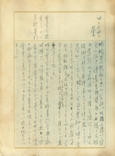 此係吳新榮寫於1941年4月14日之日記。本篇日記補述前一日吳新榮的行程。吳新榮收到妹妹吳雪金的信,信中報告她成功考取東京女子美術學校家政科。另吳新榮與黃乾拜訪明治製糖會社的渡邊原料課長,詢問關於原料委員一事。   關於日記中提到吳雪金,係吳新榮的妹妹。日治時期台灣人子弟因台灣教育制度不平等之故,雖然於1922年後設立諸多中、高等學校,但台、日人之間的不平等待遇仍未消除,在高等教育中台灣人面臨激烈的競爭,反而去日本留學會比留在台灣讀書容易的多,吳新榮、吳雪金即是其中一例。另因受傳統念影響,女性受教育的機會相對較少,而當時女子教育的內容多以培養「賢妻良母」為目標,因此課程多以縫紉、家政等內容為主。除了台灣總督府的教育方針偏向初等與職業教育外,亦有符合大眾期待的「賢妻良母」的女性形象,以此提升就學率有關。
