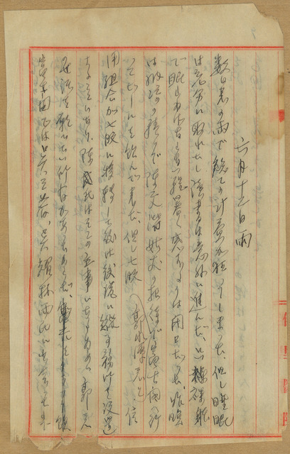 此係吳新榮寫於1941年6月12日之日記。前一日晚間,吳新榮與郭水潭等人去富士閣喝酒消暑,離開後去酒配銷所和徐清吉下圍棋。因連日下雨,原定要進行七股國民學校的身體檢查延期,於是保甲事務所旁聽產業組合監事講習會。   日治時期為建立醫療體系與改善衛生環境推行公醫制度,在臺灣各地配置公醫配合警察從事各項醫療衛生相關業務,包含風土病防疫、種痘、娼妓檢疫等,吳新榮曾於1940年9月30日的日記中自薦成為公醫。日記中提到的七股國民學校學生身體檢查亦是當地公醫的工作之一,但因當時連日下雨導致延期,直至同月16日才進行。