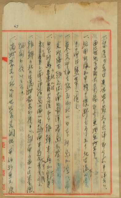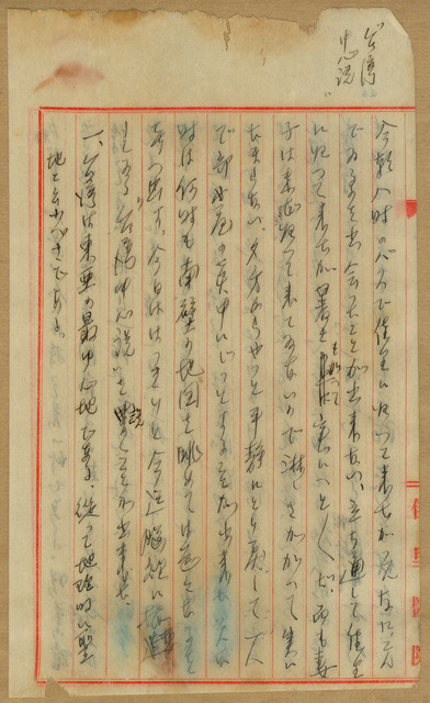 此係吳新榮1941年8月10日。吳新榮前一日帶著弟妹到台南,先去拜訪毛昭癸、黃奇珍等人,用過晚餐後到宮古座看電影「大紐約」,當日早上搭巴士回台南,返家後構思「台灣中心說」。   日記中提到的「台灣中心說」係吳新榮提出的地理觀點,據其在日記中所述,因台灣位於東亞的中心,在地理位置上有其重要意義,並詳列11點說明台灣地理位置與周邊國家的聯繫。以歷史發展來看,吳新榮所言並非毫無道理,台灣的地理位置優越,透過考古挖掘可知台灣早年便是航海的中繼站與貿易站,荷蘭領有台灣後便以台灣為基地拓展海外貿易,日治時期更將台灣做為南進政策的跳板,進入美蘇冷戰時期台灣更被美國視作防堵共產的第一線,可知台灣在地理位置上的重要意義。