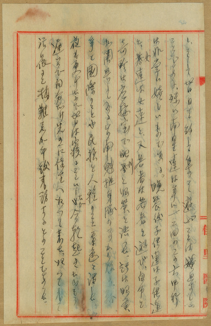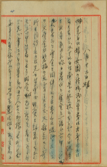 此係吳新榮寫於1941年8月12日的日記。吳新榮與弟妹吳壽山、吳雪金到六甲帶毛雪和吳南星返家,孩子們玩在一塊兒,吳新榮則和毛昭癸、毛昭川聊天。   關於吳新榮提到妻子毛雪要出席婦女團成立式之事,戰爭時期不僅是青壯年男性,婦女亦是被動員的成員之一。戰爭時期在政府提倡「家庭是戰場,戰勝從家庭」的觀念下,婦女動員多以組織愛國婦人會、保甲婦女團等形式為主,這些婦女除了擔負勞動生產的責任外,甚至有接受短期醫護訓練後到海外擔任護士(當時稱看護婦)者。
