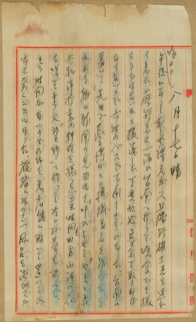 此係吳新榮寫於1941年8月17日之日記。郭水潭再次帶藤野雄士來訪,並一同到大和莊吃飯。眾人夜宿末廣旅館,繼續討論西川滿、庄司總一等人的文學作品,並延伸討論戰爭等問題。   據吳新榮在日記中所述,其與友人聚會時多半會選在咖啡廳或酒樓,如寶美樓、天國咖啡廳等,有時會進行第二、第三次聚會,若在台南待到太晚會借宿友人家中或是投宿旅館。本篇日記提到的藤野雄士曾於1941年8月15日的日記提及,此人是《大阪朝日新聞》的記者,在《台灣新文學》雜誌時便欣賞吳新榮的文學作品,並希望能與之見面,後由郭水潭引薦,並於聚會中評論當時台灣文壇中的諸位文人,如楊雲萍、張文環等人;本篇日記則提到前一日晚上吳新榮與藤野雄士、郭水潭兩人到台南吃飯,並繼續評論西川滿、庄司總一等人的文學作品。