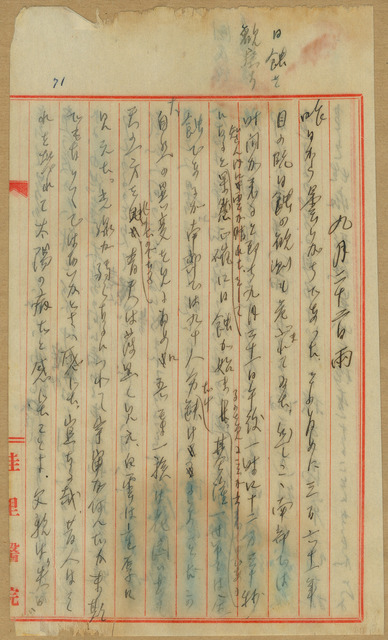 此係吳新榮寫於1941年9月22日之日記。吳新榮前一日與家人觀看日蝕;接連幾天因為下雨患者較少,於是開始進行國民體力檢查的工作。   關於日記中提到的國民體力檢查,其是依據日本於1940年4月公布並於同年9月施行之〈國民體力法〉而實施之健康檢查,台灣則於1943年2月1日起實施。國民體力檢查主要針對17至20歲的男性,主要檢查項目有身高、體重、視力、聽力等,此外亦有運動能力和疾病篩檢(如花柳病、肺結核等)。吳新榮曾於1941年8月24日參與國民體力檢查醫講習會,本篇日記則提到他將進行為期4天的檢查工作,一共要檢查約2千人,他主要負責檢查性病與體形部分,並感嘆得性病的人雖少,但普遍體格偏差。