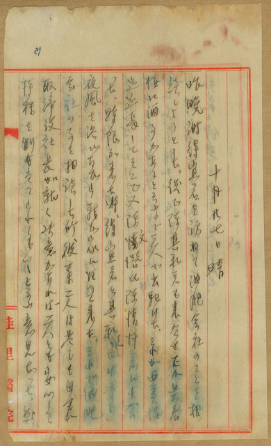 此係吳新榮寫於1941年10月27日之日記。吳新榮與謝得宜、陳其和等人商討關於佳里油肥製造株式會社的業務問題。近期北門神社舉辦祭典,吳新榮於當日參加奉告祭典。   關於日記中提到的油肥公司,係指佳里油肥製造株式會社,由方振章、徐清吉等人發起,主要經營製油、製肥和農作物加工品買賣等業務,於1941年12月22日成立,吳新榮認購200股,並擔任理事。吳新榮1941年10月10日的日記提到總督府已下達營業許可,因此近期吳新榮常為此事四處奔走、開會,當日之日記提到他去拜訪謝得宜等人與他們討論油肥公司的事情,並提到如果吳新榮有意參選董事長,他們會與以支持,吳新榮則表示自己並沒有很積極想取得職位,但若是只有他能出任他亦不推辭。