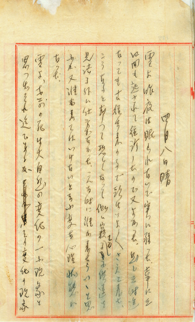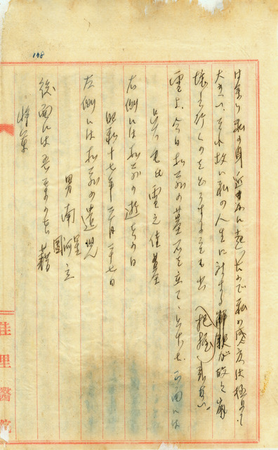 此係吳新榮寫於1942年4月8日之日記。該日為吳新榮妻子逝世後第十三日,其仍難以放下對於亡妻的思念;今日已將日式的墓碑立於墳上。   該日吳新榮將日式四角柱形狀、亡妻毛雪的墓碑立起,正面刻有「吳毛氏雪之佳墓」;右側以昭和紀年記錄逝世日期;左側則為遺兒南星、南河與南圖之名;背面則刻有吳新榮家族的本籍「將軍」。從相關照片中可知毛雪之墳並非完全以佛石、上臺、下臺三部分日式的方式建造,事實上仍帶有臺灣民俗上,將棺木置於墓碑後方的土葬墳墓風格。另外,本籍以臺灣當地的地名進行篆刻,而非中國原鄉祖籍,亦能得知臺灣人落地深根百年後,逐漸在地化的現象。