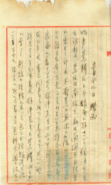 此係吳新榮寫於1942年5月14日之日記。昨日傍晚,吳新榮與黃騰騎乘自行車,分別載著南河與南圖,至子良廟拜訪林泮,由於黃騰與林泮皆有斷弦的經驗;吳三連自北京打電報來委託診來其母親的病;晚上與郭水潭、黃騰再樂春樓飲酒暢談,再至西美樓二次會;失眠之故,清晨醒後即無睡意,繼續寫稿。   吳三連與吳新榮同為本籍於臺南北門地區、鹽分地帶的著名人士。從日記中可知,吳新榮相當尊敬屬於前輩的吳三連,只要《民俗臺灣》或《臺灣文學》出刊、到手後,便會寄一份給吳三連。甚至戰爭期間,吳三連於北京地區活動之時,會請託吳新榮前往北門替他母親進行診療,不難看出兩人的交情。   吳三連畢業於日本東京商科大學(今一橋大學),日治時期曾擔任《台灣新民報》記者,為民喉舌;留日時曾參與抗日運動,爭取臺民權益。戰後初期,吳新榮除自身曾參選議員外,也曾幫吳三連進行國大代表的助選工作。此外吳三連更曾任國大代表、臺北市長、省議員、國策顧問等公職,跨足政治、經濟(紡織、水泥等)、傳媒、文教等事業,因此吳豐山稱其為「國之大老」。