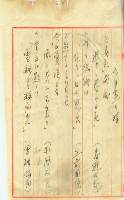 此係吳新榮寫於1942年6月13日之日記。今日為星期日,由吳新榮胞妹帶南星前往臺南遊玩,朱里與吳新榮兩人留於家中;傍晚留朱里於家中,與郭水潭等人赴富士閣飲酒,巧遇轉調新營郡的河崎、金武等人,併桌同歡;超過用餐時間後,轉至秀鑾家二次會至深夜。   從吳新榮的日記中可發現其不時會流露出大男人主義的詞句,1933年9月22日等日的日記即有提及對於女性較為負面的想法,以及與文學同好、友人們時常流連於娛樂場所間,因此時常與妻子有所爭吵。或許是倏忽間身旁親密的妻子離去,吳新榮頓時須擔起家內外大小事後,方才知道過去毛雪在背後努力支撐整個家庭,讓自己無後顧之憂的在外闖蕩,導致短期間吳新榮無法走出傷痛、與友人社交,幾個月間內未再步入酒樓的世界。然而,在妻子逝世後兩個月左右的今日,吳新榮已稍微走出傷痛,回歸過往與友人暢談飲酒,甚至二次會的生活。