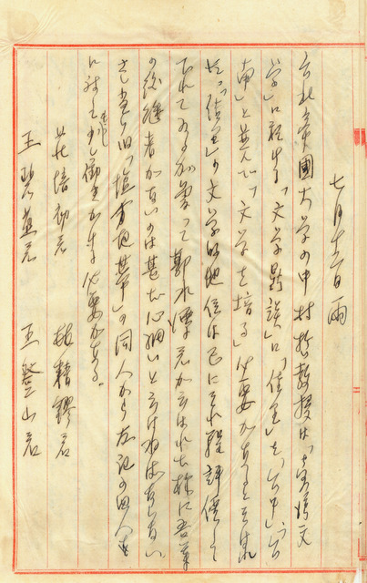 此係吳新榮寫於1942年7月12日之日記。昨晚,西港庄的松田巡查來向吳新榮推薦續弦人選,而吳新榮早以有幾為考慮「名單」;今日拜讀臺北帝國大學中村哲教授投稿於本期《臺灣文學》中的〈文學鼎談〉一文,提到在文學的地位上,將佳里與臺中、臺南並列。然而,鹽分地帶的文學作家由於無後繼者,與郭水潭商討。   1942年3月27日,由於吳新榮妻子的驟逝,自己突然需擔起傳統價值觀中「女主內」一職。體會到過去亡妻對於家庭內的奉獻,使他短時間內無法走出傷痛,並以文學作品的撰寫來療癒自身。然而,或許吳新榮因除了本身醫師的工作外,尚有地方上各式各樣如奉公團、防衛團等等的職位,再加上興趣的文學事務等等。外務繁雜之故,與身邊友人的牽線,使吳新榮在妻子長眠後兩個月左右有了續弦的想法,但未實際行動。另外,中村哲教授,將佳里與臺中、臺南在文學的地位上並列之事,或許與前幾個月由吳新榮與鹽分地帶文學家們,於《民俗臺灣》上推出佳里特輯號、撰寫地方文史相關文章有關。