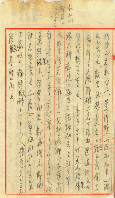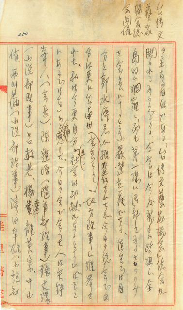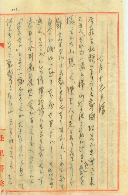 此係吳新榮寫於1942年7月15日之日記。早晨抵達臺北,先至友人鄭國津家中用早點;至城內走訪書店、百貨公司、臺灣博物館等地;前往大稻埕永樂町與友人陳培初會面,一同至明治製菓公司三樓參加今日將改組的「臺灣文藝家協會」之總會。佳里地區只有吳新榮與郭水潭被選為推薦為會員;會後與楊逵至大阪朝日新聞之局拜訪藤野雄士;晚間陳培初號召旅北同鄉,黃朝生、徐千田等人一同飲酒作樂,夜宿黃朝生家。   吳新榮所參加的臺灣文藝家協會為1940年1月1日,由西川滿所屬的《臺灣日日新報》及黃得時所屬的《臺灣新民報社》之文藝部共同鼓吹所組成之藝文團體。會長為矢野峰人、西川滿為編輯,並發行雙月刊的《文藝臺灣》。網羅全島的文學作家,郭水潭、吳新榮、張文環、龍瑛宗、濱田隼雄等人皆有參與。1941年2月該協會改組成為「文藝臺灣社」,《文藝臺灣》也改由該社團發行、西川滿作為主導。另外, 1941年5月由文學同好張文環主導創辦《臺灣文學》,則為臺灣籍文學作家作品居多的文學雜誌,相較於以西川滿等日人為主的《文藝臺灣》。1944年5月,改由臺灣文學奉公會刊行,並整併為《臺灣文藝》。