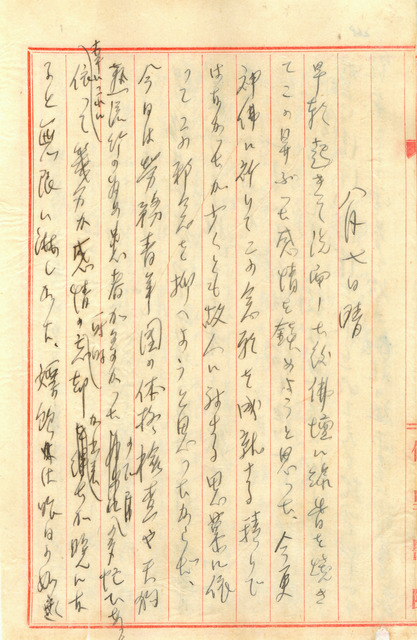 此係吳新榮寫於1942年8月7日之日記。吳新榮記述今早在佛壇前燒香來靜心;一方面要對勞務青年團進行體格檢查、另一方面又因登革熱,造成近日以來,醫院患者相當多,無法出門旅遊、轉換心境;晚上與徐清吉等人下圍棋,直至深夜兩點。   吳新榮近日以來不時透露出對於再娶亡妻胞妹毛碧梅的想法,想像「新生活」新組家庭後的規劃,但或許因妻子才剛逝世未及四個月,且續弦對象身分敏感之故,感性與理性時常在心中拉扯。然而,恰巧近期「天狗熱」(登革熱)大流行,以致吳新榮能將注意力轉移到醫院工作上。1941年底起,日本已進入太平洋戰爭時期,初期戰線不斷向南方推進,馬尼拉、香港、新加坡等地皆被日軍攻陷、占領。由於軍隊的船艦需進出日本、臺灣等地進行補給等作業,造成屬於熱帶性疾病的登革熱(病媒蚊),被帶回日本本土及臺灣,於1942-1944年間發生嚴重的大流行。1943年,在臺灣甚至超過八成以上、約五百萬的民眾遭到感染。因此,這場發生於臺灣的天狗熱,也可謂是作為日本南進基地的臺灣,因戰爭而帶來的疫情大流行。