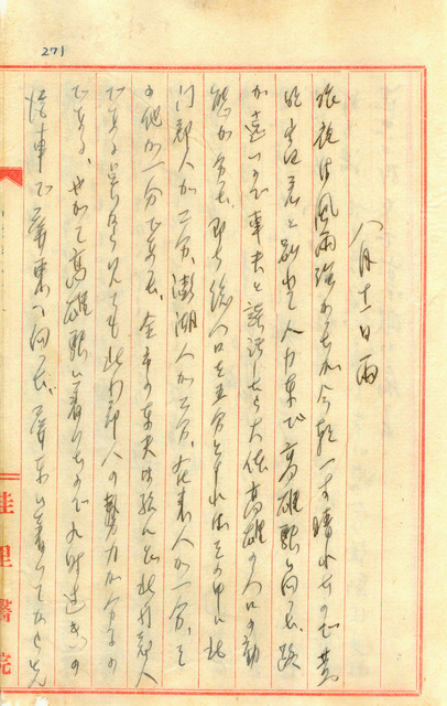 此係吳新榮寫於1942年8月11日之日記。吳新榮記述與人力車伕交談得知,高雄地區的人力車伕多來自北門郡與澎湖地區;搭乘火車前往屏東拜訪亡妻好友蘇煖;再至姑丈洪茂茹家中拜訪,用完晚膳後即又搭火車回高雄。   前一晚,吳新榮希望能有獨處、沉思的空間,而一人南下高雄散心。由於1941年中旬,有鑒於高雄市區的擴張,日人配合都市計畫,將原先位在濱線(哈瑪星)的高雄車站遷移至大港埔(今高雄車站)位置,並更名為高雄港車站。因此新的高雄車站與原先鹽埕、濱線等市區稍有距離,能藉由人力車或公車來連接兩地。