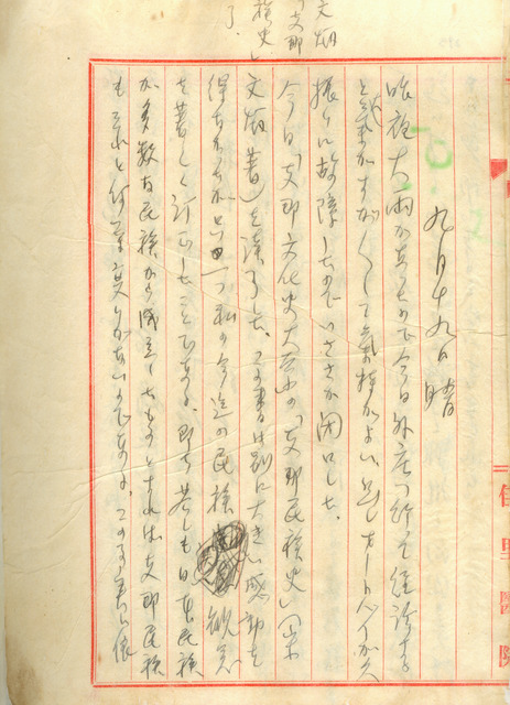 此係吳新榮寫於1942年9月19日之日記。吳新榮記述昨日友人黃奇珍來信告知,〈亡妻記〉一文使許多女性讀者表示哀泣;今日到外庄看診,機車卻臨時壞掉;讀完《支那文化史大系》中宋文炳所著之《支那民族史》。   由宋文炳所撰之《支那民族史》為《支那文化史大系》中的第一卷,於1940年由大東出版社於東京出版,包含「支那」的醫學、經濟、商業、政治思想、水利、女性生活、食糧等等,共13卷。其中在民族史的部分提到,如今若尚有純粹的漢民族,大概僅存在長江流域,因此主張民族的純粹性是無意義的,吳新榮認同此看法,並修正原先對於民族的概念。