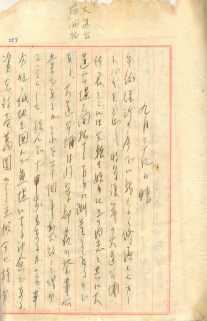 此係吳新榮寫於1942年9月24日之日記。吳新榮預計與父親、吳氏宗親等六人於將軍的大道公埔進行「大道公塭」的養殖事業;今日為中秋,將庭園中生產的文旦送給友人們。晚上為亡妻供上飯菜、文旦與月餅,與孩子們在家中渡過。   大道公埔為學甲地區十三庄先民,因奉祀保生大帝而將登陸上岸的謝厝寮(今學甲中洲地區)稱為大道公埔。而吳新榮預計於此向祭祀公業承租該塊土地二十年,其中一半窪地欲作為魚塭使用,資本額約一萬圓。水產養殖自清代起在臺灣即出現,進到日治時期後,透過總督府官方的力量介入,成立水產試驗場、導入現代化的養殖方式,在技術方面給予養殖知識上的講習,以及水產方面的獎勵補助。再者,更建立臺灣的水產養殖、漁業,從漁港、修船、製冰、水產冷藏等等到水產金融機構的基礎建設整備齊全。