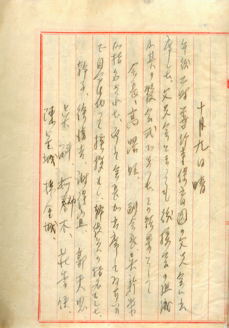 此係吳新榮寫於1942年10月9日之日記。今日下午吳新榮參與善行寺保育園的父兄會,被指名為副會長;傍晚搭巴士前往臺南,將柚子分送給黃奇珍,並將昨日整理的書畫請蘇新進行裝裱;回到帝國商事歡送黃奇珍前往內地(日本);再至三和商工,留宿於此。   父兄會為大正末年開始,由受新式出等教育的學童之家長所組成之團體。目的為與學校建立聯絡機制,以及適時提供學校必要的協助。雖名為父兄會,然而實際出席者多為母親。而,吳新榮於妻子逝世後,曾於日記中提到要擔起毛雪過去之工作,好好看診、照顧家庭。因此,此次於善行堂保育園、次子南河的父兄會則由吳新榮出席參加。