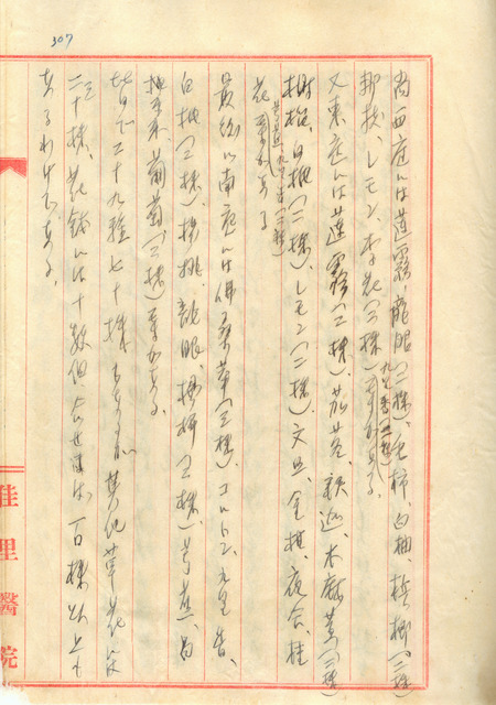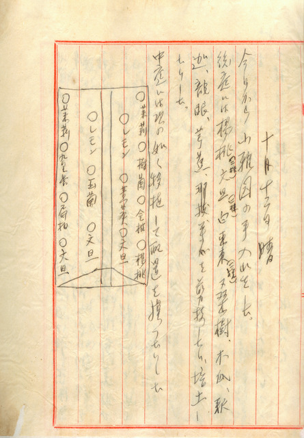 此係吳新榮寫於1942年10月12日之日記。吳新榮今日著手整里佳里醫院後的小雅園。將原先中庭的花草進行重新配置,加上西庭、東庭與南庭的部分,共有29種70顆樹木、花草20-30顆、盆栽10餘個。   吳新榮所經營之佳里醫院係屬1932年3月,吳新榮自東京醫專畢業後,同年9月返台,11月繼承叔父吳丙丁經營的佳里醫院。此後,為擴充醫院設備和病房數,在租用土地、添購器材上,投入不少心力。另外,在佳里醫院後方(善行堂南側、樂春樓北側),以父親吳萱草的別號「雅園」而將花園命名為「小雅園」,於1933年10月中旬完工。其主要建築有「琑琅山房」及「八角涼亭」以及1963年後所建的「世外居」。「琑琅」為「蕭壠」之諧音,由於佳里過去為西拉雅族活動的範圍,吳新榮乃稱該建築為「琑琅山房」。其為1942年為紀念亡妻毛雪,於該日日記前一周,將病房改做為「琑琅山房」,著名的〈亡妻記〉亦是在此空間內所撰寫。除此之外,1933年以吳新榮為首的鹽分地帶文學同好,於小雅園創立的「佳里青風會」,吹起北門地區文藝風氣之號角。