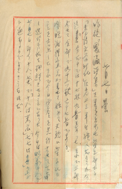 本篇為吳新榮寫於1943年07月07日日記,吳新榮《震瀛詩集》第三部還需一段時間;謝得宜來家中向父親告知榮子事宜,並認為今日是個好日子。 根據近期日記所述,吳新榮著手《震瀛詩集》的成形且將之分期,並體認到自己正經歷時代的轉換,目前情況是第三部之後需要一段時間完成,可能需要二至三年,而第四部則尚未預計。謝得宜為台南學甲人,在佳里開業為牙醫師,是吳新榮留學東京時認識的同鄉好友,可在近期的日記中看到吳新榮時常邀約謝得宜前往酒家或咖啡廳,商討事情或暢談。吳新榮深知家中最近要辦喜事開心不已,並派雪金到台南商討進行方式,雪金為吳新榮之二妹;甚至認為今日昭和十八年七月七日是好日子,如文中提到「十八是末廣」,因十八直書就像是一扇子形狀,為擴展興盛的意思,而「七七是喜」,㐂為喜字草書,所以將「七七」比喻為「喜」字,如七十七歲是喜壽的祝福等。