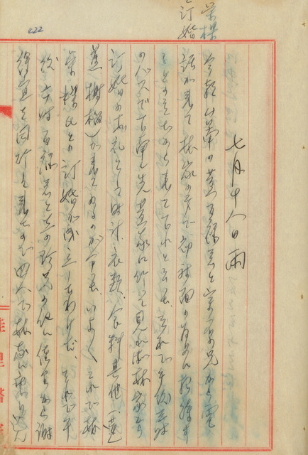 本篇為吳新榮寫於1943年07月18日日記,吳新榮忙於訂婚事宜,並正式地到林榮樑小姐家裡拜訪家長以及親戚,也是與林榮樑小姐的第一次見面,順便商量婚禮當天流程。 根據日記所述,近期吳新榮忙著籌備婚禮事宜,而今日則受到林榮樑小姐家的正式邀請,且林家已將訂婚回禮送至黃百祿家中,意味著即將完成訂婚儀式。林朝輝,為林榮樑小姐之兄,為台南市開業牙醫師,兄妹兩人皆為領養的,所以日記中敘述林榮樑有正母和生母,即為此原因。吳新榮對於第一次見到林榮樑小姐甚為滿意,對方性格也大致了解,但吳新榮作為醫師,仍不免擔心是否有家族遺傳之疾病,遺傳在林榮樑小姐身上。