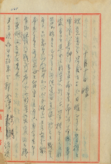 此係吳新榮寫於1943年1943年10月10日日記,今天秋高氣爽,吳新榮帶妻兒等人到將軍;傍晚,與郭水潭、徐清吉等人到台南處理相關事務。   日記中提到與郭水潭等人到台南向律師致謝一事,是指郭水潭因改姓名入獄一事。1943年1月,郭水潭遭地方法院檢察官約談後,被以「思想有問題」為由,入獄8個月。吳新榮在1943年1年22日的日記中亦寫道郭水潭被換至檢察局後便未歸,為此,與徐清吉、黃百祿等友人聯繫律師、探聽消息。10月2日出獄,10月3日,吳新榮與友人們在小雅宴設宴歡迎郭水潭歸來。   又,日記中提到的製油是指吳新榮與蘇新、徐清吉、黃奇珍等人於1941年籌建的佳里油肥會社,同年10月取得營造許可,12月22日正式成立,主要業務為以胡麻、花生為原料的榨油業務,後因營運不佳,擬解散油肥會社(1943年4月2日日記),為善用油肥工廠廠址,吳新榮提議與三和物產合作養兔事業,進行兔肉、兔皮等加工(1943年4月16日日記)。