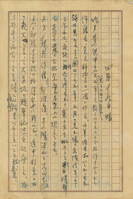 此係吳新榮寫於1945年4月19日之日記。前一日晚間吳新榮應邀到黃庚身家中慶祝其兒子回家。傍晚時則與蘇新等人一同參加廣田朝一長孫出生的慶祝招待宴,途中繞去將軍和吳萱草巡視大道塭被轟炸後的狀況。   美軍在第二次世界大戰末期對台灣的空襲轟炸主要集中於1944年10月至1945年8月,吳新榮的日記中亦多有提及躲避空襲之事,或是招待到鄉下躲空襲的客人,可見空襲轟炸深深影響了吳新榮的日常生活。近日因將軍遭遇空襲,吳新榮多會抽空到將軍老家探望父母親的狀況,本篇日記則提到他與父親吳萱草去巡視大道塭被轟炸的狀況。有趣的是,吳新榮曾在1945年4月15日的日記中提到,吳國卿來向他報告將軍溪被轟炸的情形,說到當地的居民因害怕而去請示大帝爺,得到的答案是武德星和天狗星起爭執所引起的,由此可知在當時面對美軍轟炸時,在地居民因心生不安而去請示神明,得來的答案是武德星與天狗星起爭執,從民俗信仰的角度解讀空襲轟炸亦是一種新的觀點。