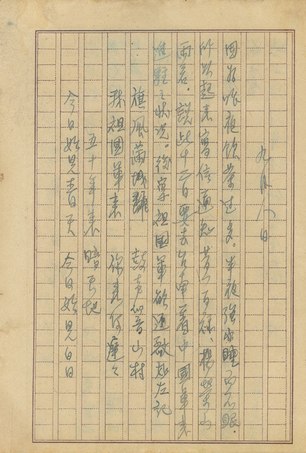 此係吳新榮寫於1945年9月8日之日記。吳新榮寫信給黃百祿、楊榮山兩人,說明12日去看中國軍進駐台南的狀況,並寫下〈祖國軍歡迎歌〉。   回顧1945年終戰前後吳新榮的日記內容,在1945年8月15日日本宣布投降之前,他的日常生活深受戰爭影響,頻繁的空襲讓他身心俱疲;在8月16日時他與三五好友跳入溪中「洗落十年來的戰塵及五十年來的苦汗」,並大聲宣告新生活即將展開,欣喜之情溢於言表。又吳新榮十分專注時局的動態,雖然因為消息不流通加上謠言四起,讓他因為前途不明而感到憂慮,但聽聞來自祖國──中國的軍隊要進駐台南時十分高興,打算招呼友人一同前往「去看這歷史的感激」,並於日記中寫下〈祖國軍歡迎歌〉,用以歡迎中國軍隊,該歌曲的歌詞中洋溢著吳新榮對於祖國軍隊到來的欣喜之情,並表達出被日本統治50年來的苦悶終於得已解除,自今日起開始看見青天、得到自由。