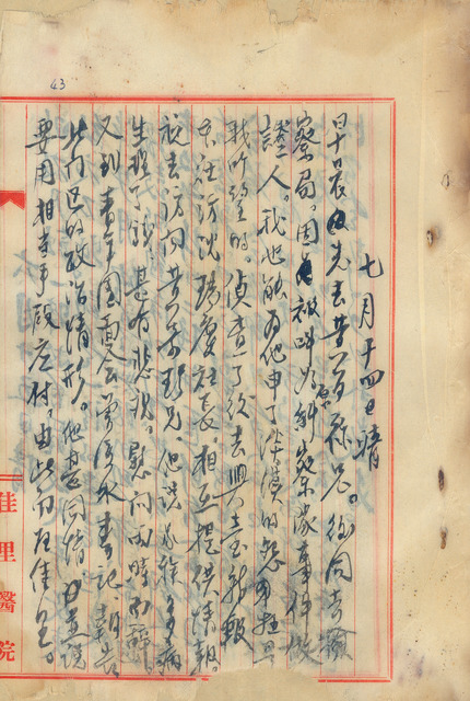 此為吳新榮1946年6月14日日記,早上吳新榮拜訪黃百祿,兩人一同前往檢查局。起因原糾察隊事件為黃百祿做證人。之後吳新榮前往《興臺新報》拜訪。探訪完黃奇珍後前往青年團,報告北門區的政治狀況。   本篇日記中提及的黃百祿,為吳新榮就讀於臺灣總督府商業專門學校(臺南)的同學。畢業於日本中央大學法學部,日本高等文官試驗行政、司法兩科合格。返臺後,於臺南市為開業律師,旭翠會成員之一。在日記中可以看出,黃百祿幫忙了吳新榮許多法務上的困難,也是吳新榮的好友。   又,日記中提到的三民主義青年團,簡稱為三青團,1938年7月9號成立於武昌,當時為中央俱樂部組織(Central Club,簡稱CC)派掌握的中央黨部之外,中國國民黨黨內重要組織之一。1942年在台灣成立三民主義青年團中央黨部直屬台灣區團部,1945年許多社會精英加入三青團,吳新榮在1945年12月正式參加三青團,1947年爆發二二八事件,多數三青團成員被捕入獄,成空有名無運作之實的團體,最後在1947年9月將三青團強制併入國民黨,成員也必須成為黨員,併入國民黨之青年部。