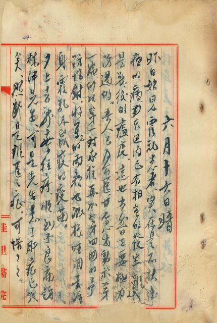 此為吳新榮1946年6月16日日記,昨日開始為霍亂患者治療,因為霍亂已在北門區流行。身為醫生的吳新榮勢必在第一線付出自己的專業。晚上前往子良廟拜訪林泮。   本日日記提到霍亂,為一種急性腹瀉疾病,染上主因通常為環境衛生與飲食習慣所導致。在日治時期台灣曾發生大規模流行,與瘧疾、天花、鼠疫、腸胃道感染,堪稱當時的四大醫療衛生問題,霍亂被列為法定傳染病之一。1920為天花與霍亂在日治時期最後一次大流行,之後都是零星發現。到了戰後初期,當時兩岸交通日益頻繁,加速傳染病流竄,加上原本在台擔任檢疫工作的日籍人員遣返後,港口檢疫工作停頓,出現防疫漏洞,包括霍亂、狂犬病、鼠疫等傳染病從中國地區再度入侵;根據統計,民國35年台灣共有3809人罹患霍亂,2210人不幸喪命,死亡率高達58.02%,是第3次霍亂大流行。又,林泮,是北門七子的林精鏐的父親,本名林芹香,是當地的傳統詩人,對於中國的四書五經等文籍有著很大量的研究,甚至多次赴中國考證學習,對於當地小孩文學的教育有著很大的影響,林精鏐就繼承其父性格,在作品中相較吳新榮等人的奔放,林精鏐的作品更傾向務實的風格。