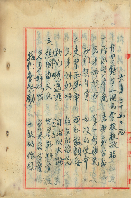 此為吳新榮1946年6月25日日記,吳新榮編寫出佳里鎮第一國民學校校歌,內容如下: 一、 源流黃帝裔 志繼鄭公節 兄弟姉妹呀 第一的國民 我們該自覺 母校的使命 二、 東望玉山峯 西臨鯤鯓海 兄弟姉妹呀 佳里的健兒 我們應邁進 自治的大路 三、 祖國(大同)舊文化 世界(民生)新科學 兄弟姉妹呀 榮譽的學童 我們當勉勵 一致的作風    而這首由吳新榮編寫的校歌,在現今持續沿用著。