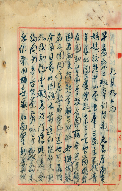 此為吳新榮1946年7月9日日記,吳新榮搭車前往台南,先前往探訪家人,後至中山堂出席三民主義青年團的團慶典禮,結束後與陳雲鵬君拜訪陳清曉 ,而後一同到貴賓茶房吃午餐。和吳南星到赤崁戲院看「泰山的再現」。晚餐與黃奇珍共餐後,獨自前往庶民組合樓上出席團務會議。   日記中提到的三民主義青年團,簡稱為三青團,1938年7月9號成立於武昌,當時為中央俱樂部組織(Central Club,簡稱CC)派掌握的中央黨部之外,中國國民黨黨內重要組織之一。1942年在台灣成立三民主義青年團中央黨部直屬台灣區團部,1945年許多社會精英加入三青團,吳新榮在1945年12月正式參加三青團,1947年爆發二二八事件,多數三青團成員被捕入獄,成空有名無運作之實的團體,最後在1947年9月將三青團強制併入國民黨,成員也必須成為黨員,併入國民黨之青年部。庶民組合成立於1924年5月,全名為有限責任台南庶民信用組合,為小產階級提供金融存放款服務,達到經濟保護的功能,戰後改名為臺南市第三信用合作社,沿用至今。