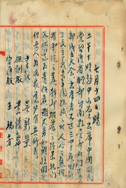 此為吳新榮1946年7月14日日記,早上,吳新榮前往中山堂出席中國國民黨臺灣省黨部臺南縣黨部北門區黨部成立大會。吳新榮被推選為幹部之一。而從中山堂返家後,楊振帶伴手禮與聘金來拜訪。午餐後,吳新榮將伴手禮分給親朋好友們。下午,前往雙春村服務做防疫工作。騎腳踏車出發,一邊前往目的,一邊送禮。   日記中提到的三民主義青年團,簡稱為三青團,1938年7月9號成立於武昌,當時為中央俱樂部組織(Central Club,簡稱CC)派掌握的中央黨部之外,中國國民黨黨內重要組織之一。1942年在台灣成立三民主義青年團中央黨部直屬台灣區團部,1945年許多社會精英加入三青團,吳新榮在1945年12月正式參加三青團,1947年爆發二二八事件,多數三青團成員被捕入獄,成空有名無運作之實的團體,最後在1947年9月將三青團強制併入國民黨,成員也必須成為黨員,併入國民黨之青年部。下午吳新榮因公醫身分前往雙春村進行防疫工作,也順道前往朋友家贈送喜餅,在台灣不同地區有不同送喜餅的方式,有些在婚宴前分送,有些則在婚宴後,送喜餅的傳統是把喜氣分享給親戚朋友。
