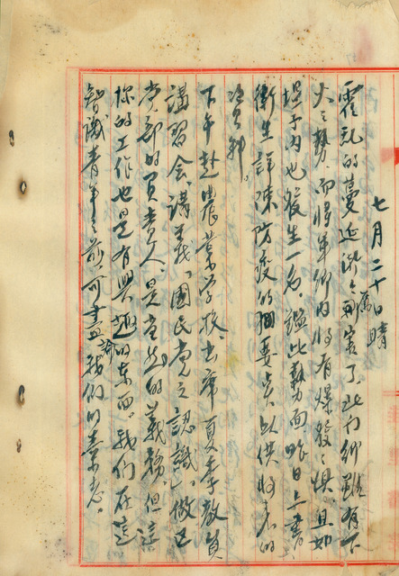 此為吳新榮1946年7月20日日記,霍亂慢慢擴散至佳里地區。昨日,吳新榮以書面建議上級機關防疫要點。下午,前往學校,出席夏季教員講習會。   根據吳新榮日記記載,吳新榮為公醫,必須被指派前往鄉鎮進行防疫,而當時霍亂,為一種急性腹瀉疾病,染上主因通常為環境衛生與飲食習慣所導致。在日治時期台灣曾發生大規模流行,與瘧疾、天花、鼠疫、腸胃道感染,堪稱當時的四大醫療衛生問題,霍亂被列為法定傳染病之一。1920為天花與霍亂在日治時期最後一次大流行,之後都是零星發現。到了戰後初期,當時兩岸交通日益頻繁,加速傳染病流竄,加上原本在台擔任檢疫工作的日籍人員遣返後,港口檢疫工作停頓,出現防疫漏洞,包括霍亂、狂犬病、鼠疫等傳染病從中國地區再度入侵;根據統計,1946年台灣共有3809人罹患霍亂,2210人不幸喪命,死亡率高達58.02%,是第3次霍亂大流行。