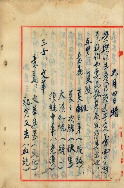 此為吳新榮1946年9月4日日記,吳新榮妻子林榮樑生產,超過預產期,吳新榮也認為要先為其子或女命名。   從這段日記可以看出,雖然在當時台灣醫療技術或是生育觀念改善不少,但女性面臨生育過程中的難產,還是有相當大的風險存在。以下為吳新榮為子女命名的意義,五男:夏統意義:夏雄之弟(胞弟)、夏之次緒(秋生)、大漢一統(統一)復統中華(光復);三女:文萃意義:文華集萃(文化)、記念父志(血統),文中吳新榮為孩子取名的意義,象徵著吳新榮民族思想,根據1941年1月29日記中,吳新榮改姓名的依據是以中華民族思想,反映出即便被日本政府所統治,也保有自己的思想。