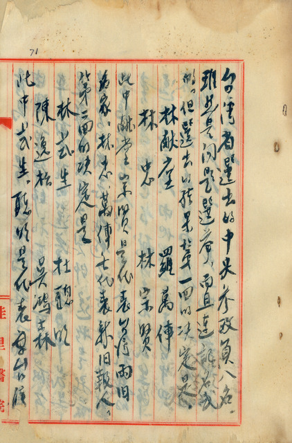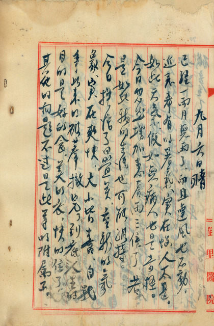 此為吳新榮1946年9月6日日記,今日天氣炎熱且久而未雨。病患突增兩倍以上,正好讓煩惱生計的吳新榮鬆一口氣。整理好房間的吳新榮,思考著人生的意義。最後提到臺灣省選出的中央參政員八名,其中,林茂生為吳新榮所尊敬的老師。   中央參政員,為國民參政會參政員,在1938年至1948年間國民參政會的組成人員,而人員的提名是根據《國民參政會組織條例》規定,參政員分別由國防最高會議、各省市政府及省市黨部聯席會議等高級會議,提供人選,再由中國國民黨中央執行委員會決定。此次公布為第四屆中央參政員,林忠、林宗賢、羅萬俥、林獻堂、吳鴻森、林茂生、杜聰明、陳逸松為代表台灣地區作為中央參政員。