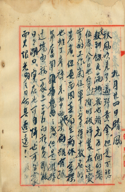 此為吳新榮1946年9月24日日記,秋天將至,今日吳新榮在醫院中處理工作,但醫院病患不多,收入減少,目前的財務狀況也是吳新榮煩惱之事。寄來的人民導報裡刊登著吳新榮的作品,有被人稍稍修改,對此吳新榮不太滿意。   《人民導報》創刊於1946年1月1日台北,核心人員為鄭明祿、王井泉、宋斐如、王添灯,編輯記者為包括蘇新、白克、陳文彬、夏邦俊、吳克泰、周青、呂赫若、楊毅、黃榮燦等,辦報精神則為督促政府「洞悉民意、認識民情、知所採擇、知所改革」,並以「報導民間不受注意的反應與要求」為最高辦報目的。最後因報導二二八事件相關內容,而被政府強行解散。