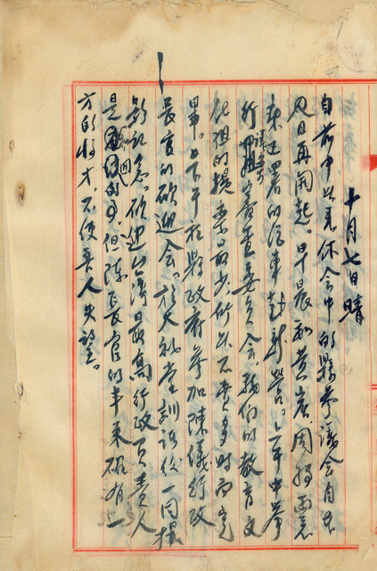 此為吳新榮1946年10月7日日記,因縣參議會再度開啟,吳新榮與黃炭、周縛一同搭車前往新營,上午舉行議案審查委員會,下午接待陳儀來訪,在聽完陳儀訓話後一同攝影留念。   台灣省參議為中華民國政府接收臺灣後,實施的地方自治單位,1945年12月26日公布「臺灣省各級機關成立方案」,成立村里民大會、鄉鎮民代表會、縣參議會等自治單位,更在1946年4月15日成立各縣、市參議會後,即依國民政府公布之省參議員選舉條例以及省參議會組織條例之規定後,全省各縣市參議會間接選舉省參議員為37人,並於民國1946年5月1日在臺北市,正式成立臺灣省參議會。縱觀吳新榮日記,在1936年,吳新榮曾幫助友人王烏硈參選州廳議員,1946年3月吳新榮也當選台南縣參議,由本日日記可得知,吳新榮想更進一步實現自己的政治生涯。