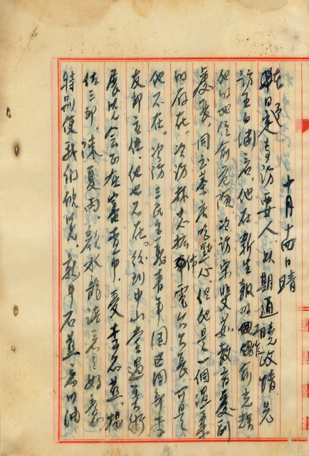 此為吳新榮1946年10月14日日記,吳新榮拜訪《新生報》中編輯部的王白淵,接著拜訪教育處副處長宋斐茹(如),再訪電臺臺長林忠與李友邦,但都未如願見面,到了中山堂,巧遇美術展覽會之審查會,吳新榮在接受導覽後拜訪王添灯,晚上在與陳文彬暢聊至八點,最後搭車返回佳里。 日記提到的三民主義青年團,簡稱三青團,1938年7月9號成立於武昌,當時為中央俱樂部組織(Central Club,簡稱CC)派掌握的中央黨部之外,中國國民黨黨內重要組織之一。1942年在台灣成立三民主義青年團中央黨部直屬台灣區團部,1945年許多社會精英加入三青團,吳新榮在1945年12月正式參加三青團,1947年爆發二二八事件,多數三青團成員被捕入獄,成空有名無運作之實的團體,最後在1947年9月將三青團強制併入國民黨,成員也必須成為黨員,併入國民黨之青年部。王添灯,(1901年8月8日-1947年3月),曾為台灣文化協會成員,在戰後擔任《人民導報》社長與台灣省參議會議員,在日記與王添灯同為政治參與人,吳新榮數次前往拜訪,討論關於政治上的議題。