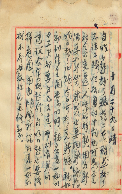 此為吳新榮1946年10月29日日記,吳新榮從昨日開始抄寫帳本,在抄寫過程中,感嘆著台灣時過境遷、人事已非。抄完舊帳本後,吳新榮開始抄起新的帳本。明日,打掃因被颱風摧殘過的庭院。   日記提到所謂颱風,因台灣地理位置,長年受到颱風的影響,根據中央氣象局統計,其中以 8 月最多,次為 7 月和 9 月,因此每年之 7至 9 月可說是臺灣的颱風季,台灣平均一年颱風登入次數,大約為三到四次,而根據吳新榮1946年9月26日記記載,讓吳新榮無法入眠的颱風,為1946年9月24日侵台的葵瑞達颱風。